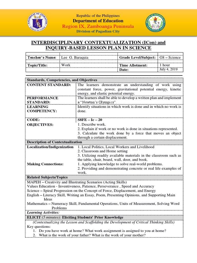 Template And Sample Lesson Plan Pagdiv2019 Docx Inquiry Based Learning Force